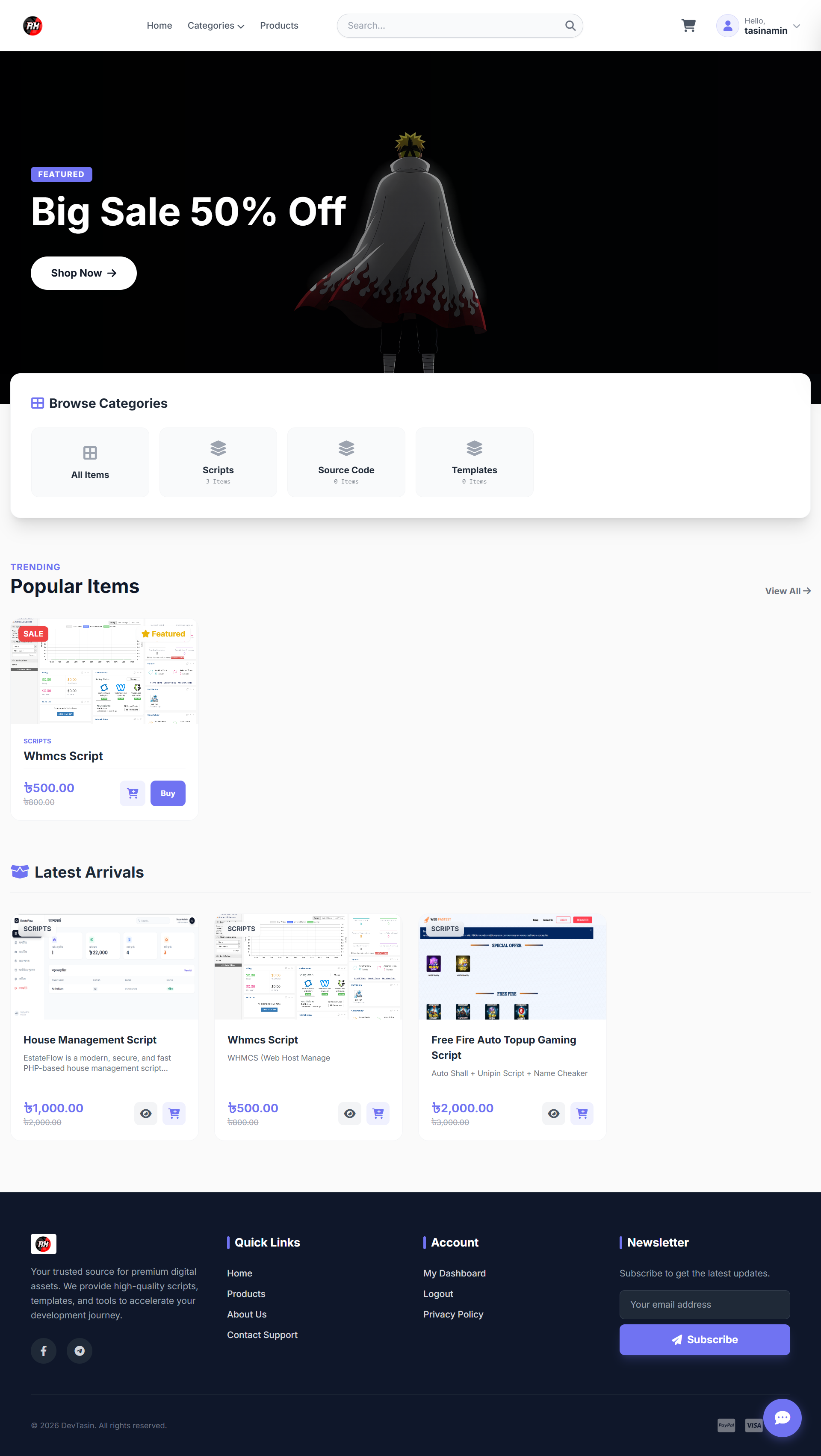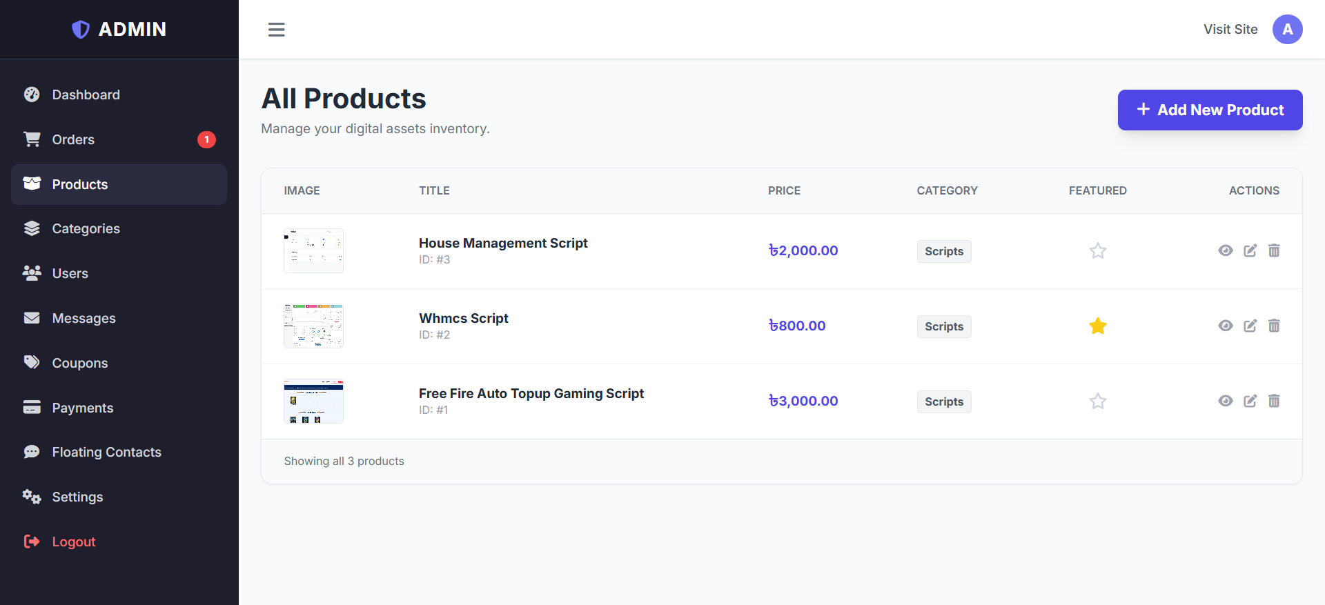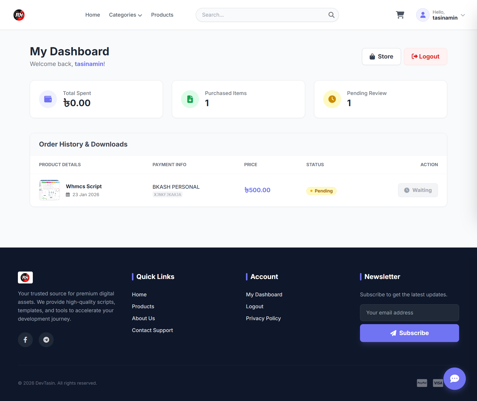 Secure File Delivery: The system hides actual file paths (storage/products/...) using a protected PHP handler, preventing unauthorized link sharing.