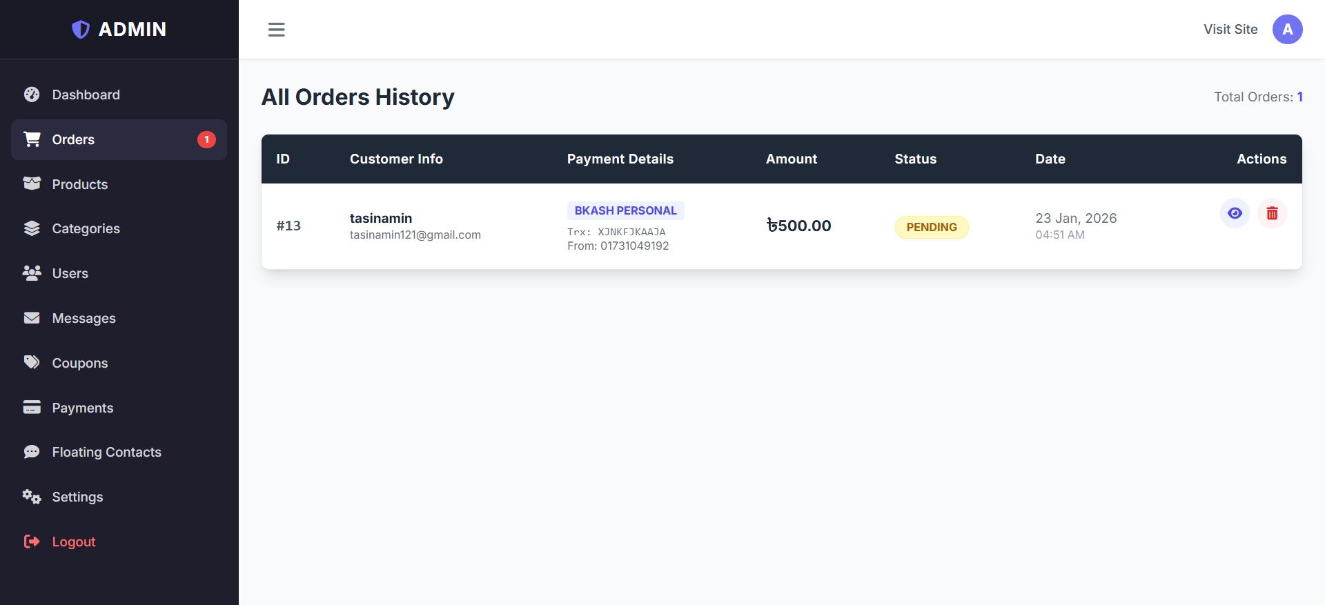 Track order status (Pending/Active).