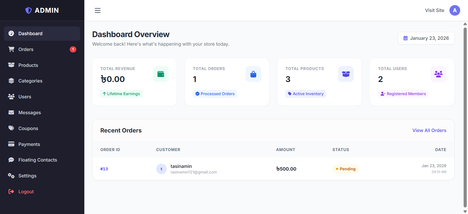 Insightful Dashboard: View real-time statistics for total sales, pending orders, and active products.